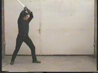 Das Schwert wird über dem Kopf gehalten, der Ort zeigt nach oben, leicht nach hinten gerichtet.