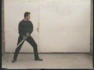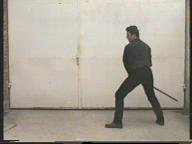 Das Schwert befindet sich auf der rechten Seite, der Ort ist nach hinten in Richtung Boden gerichtet, die lange Schneide (der Hand abgewandt) ist nach vorne gerichtet.