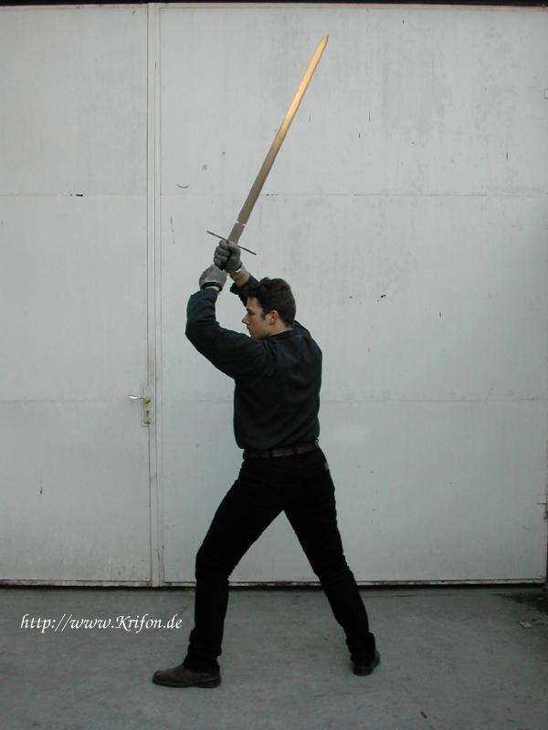 stehe mit dem linken Fuß vorn und halte dein Schwert (...) mit gestreckten Armen über deinem Kopf.